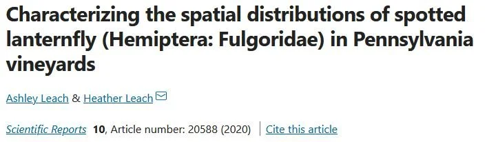 Spotted lanternfly (SLF) is an invasive insect in the Northeastern U.S. projected to spread nationally and globally. While SLF is a significant pest of vineyards, little is known about the pest in grape agroecosystems including its spatial ecology. SLF spatial patterns were analyzed using a combination of approaches including generalized linear mixed effect models, Moran’s I statistic for spatial clustering, and Empirical Bayesian Kriging. Analysis revealed that SLF displayed significantly clumped distributions in monitored vineyards. Approximately 54% and 44% of the respective adult and egg mass populations were observed within the first 15 m of the vineyard edge. Importantly, the spatial concentration of adults at the edge was consistent temporally, both between years and weeks. Moreover, high populations of SLF on vines were significantly correlated with reduced fruit production in the following year. Mark-release-recapture of SLF revealed that higher proportions of SLF were recaptured on vines with high pre-existing SLF populations, indicating that SLF may exhibit aggregation behavior along vineyard perimeters. Monitoring and management efforts for SLF should be prioritized around vineyard edges as it may significantly reduce infestations and subsequent damage. MORE INFO FOUND HERE.