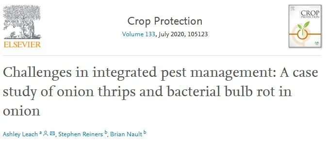 Idealized integrated pest management incorporates multiple tactics (chemical and non-chemical) to control a suite of pests in agriculture. In other words, you should be getting the biggest bang for your buck possible! But sometimes, IPM doesn’t work out the way we expect. Like what’s shown below, where we had excellent thrips control with ‘Avalon’ but way more bacterial bulb rot.