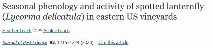 If we want to control a pest, we need to know when to look for them. As SLF’s impact increases, Heather Leach and I have worked together to improve monitoring efforts in PA vineyards. This is part 1 of “…when is SLF?” Stay tuned for part 2 for “….where is SLF?”.